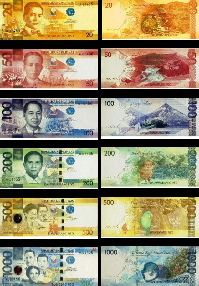 紙幣の種類:P1000、P500、P200、P100、P50、P20