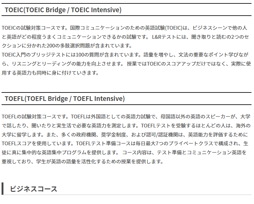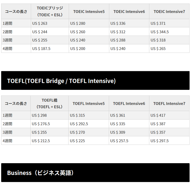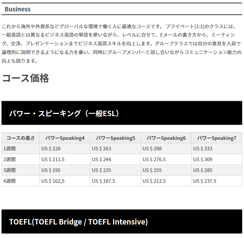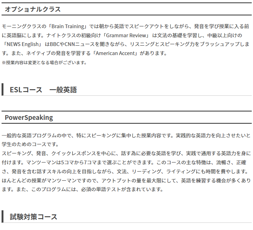 できる限り予算を抑えて長くご留学されたいにもお勧めです。コースは一般英語のPower Speakingから試験対策のTOEIC、TOEFL、社会人向けのビジネスコースがあります。周辺施設はレストラン、カフェ、コンビニエンスストア、モール、レジャープール施設から病院まで安心して生活できる環境が整っています。